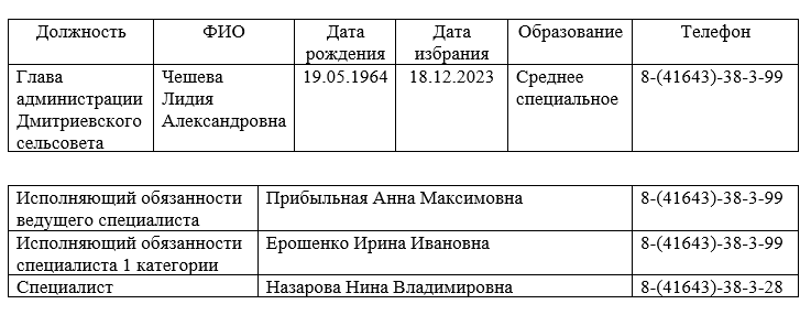 Состав администрации Дмитриевского сельсовета